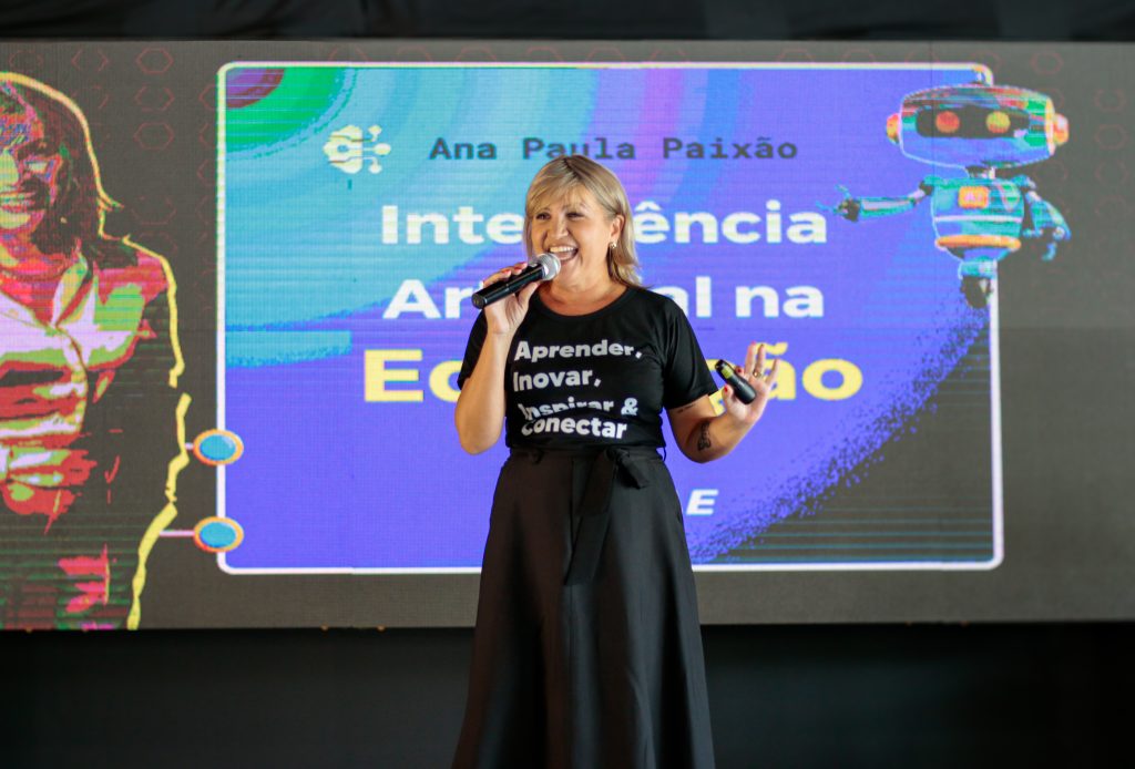 Inteligência Artificial (IA) na Educação, com a palestrante Ana Paula Paixão, com o assunto o impacto da inteligência artificial na educação. Os professores tiveram contato com ferramentas, exemplos práticos e reflexões sobre como a IA pode facilitar o ensino, melhorar a aprendizagem e preparar os estudantes para o futuro.
